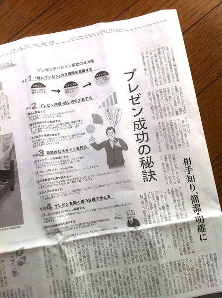 先週土曜、10月12日の日経新聞にインタビュー記事が掲載されていました。東京オリンピック開催決定で「プレゼン」が人気キーワードの今日この頃、そんな「プレゼン」特集記事でした。記事内容は、「論理的にプレゼンする技術 聴き手の記憶に残る話し方の極意 (サイエンス・アイ新書)」に書いた内容+アルファです。